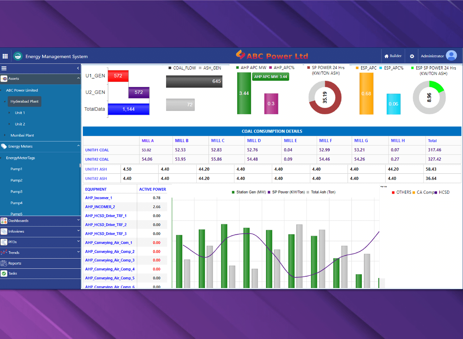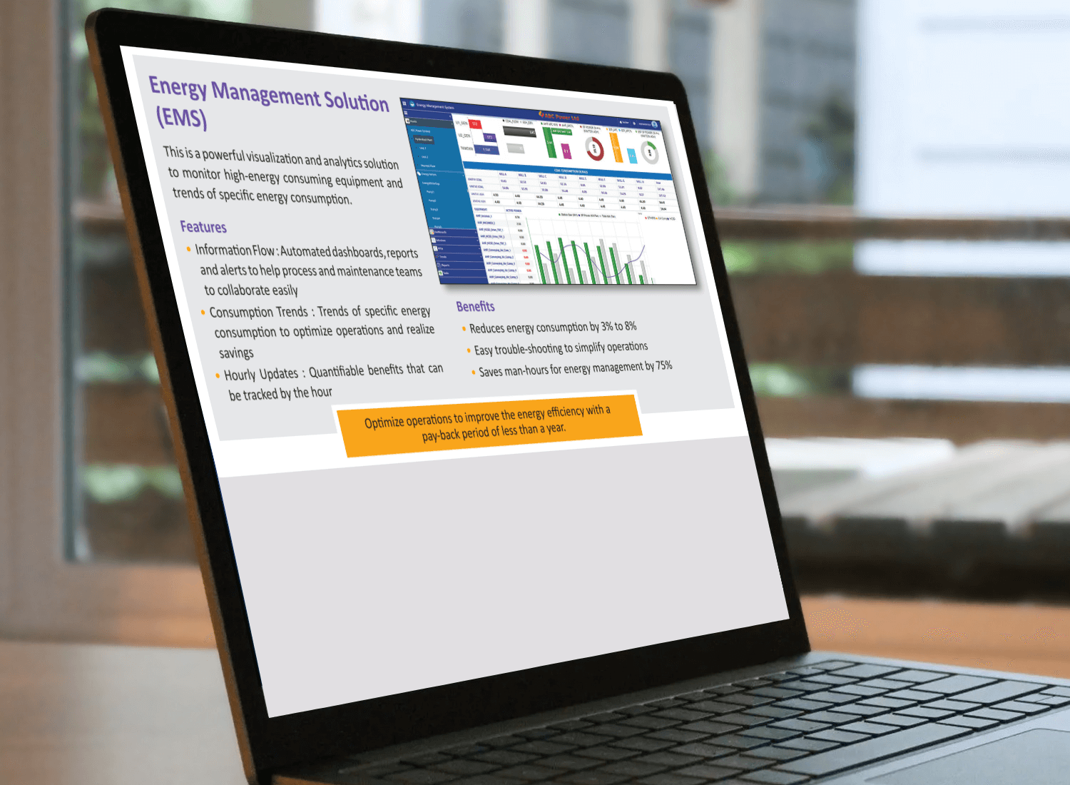 The Energy Management System (EMS) plays a crucial role in optimizing energy consumption and thereby improving the bottom-line of industrial facilities by carrying out a set of related tasks. The system interfaces with power tracking and metering equipment installed throughout the facility to collect data. It also provides real-time visibility into power usage and identifies areas where energy efficiency improvements can be made so that facility managers can make informed energy-saving decisions. Notifications are sent via e-mail or SMS for notable events and abnormal conditions. The system also helps in optimizing energy consumption and production scenarios. By leveraging this optimization, industrial units can achieve cost savings while maintaining production efficiency.